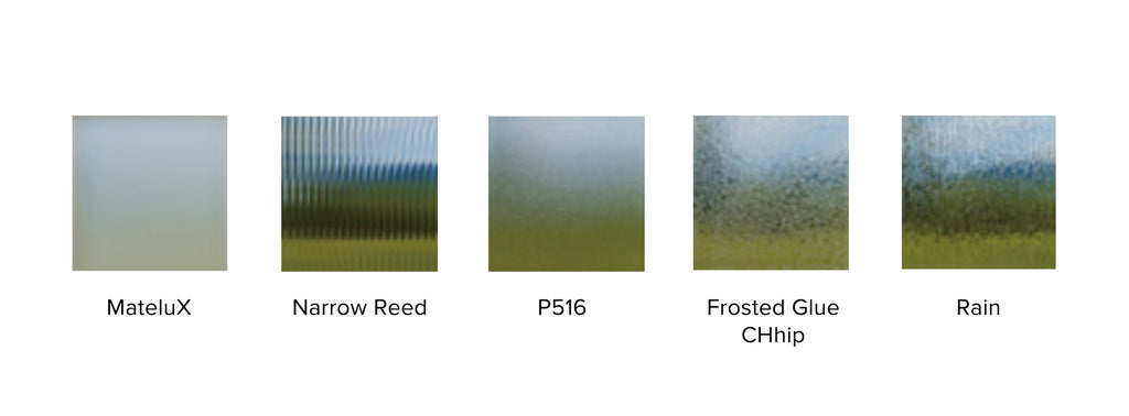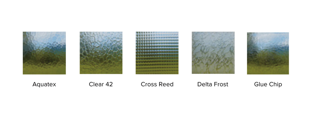 TEMPERED safety glass (standard on all Luvindow windows and doors). OBSCURE patterned glass to let in light while obscuring vision.