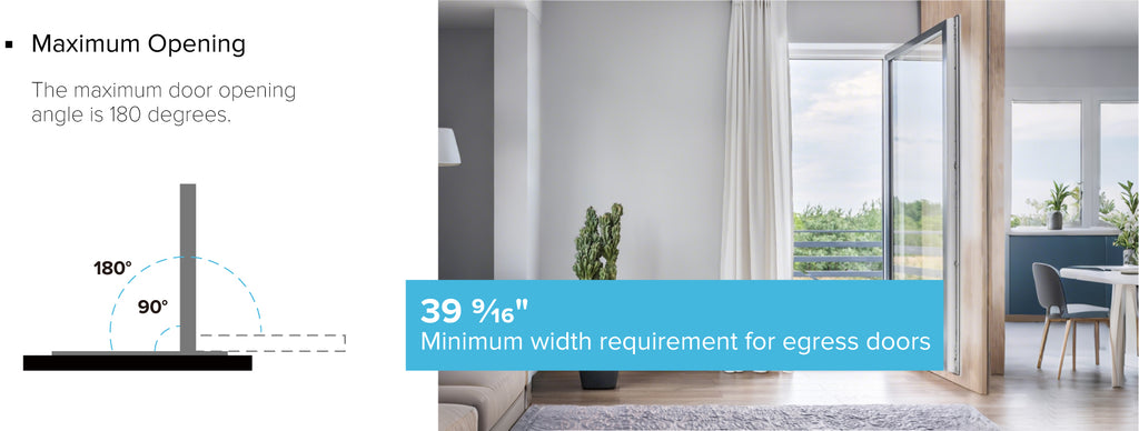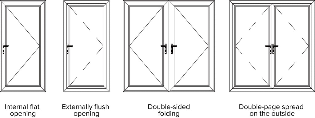 Inward single opening, outward single opening, inward double opening, outward double opening, door with window.