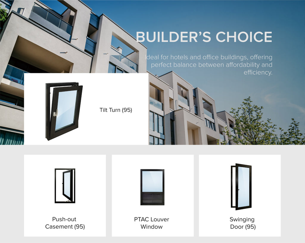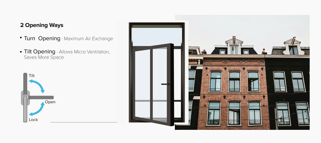 Tilt & turn window is commonly found in Europe and gaining popularity worldwide. This innovative window features a dual-action hardware system that allows it to tilt open from the top for ventilation, similar to a hopper window, and swing in from the side like a casement window. Tilt & turn windows are known for their superior energy efficiency, security features, and sleek design, making them a popular choice for modern homes and buildings.